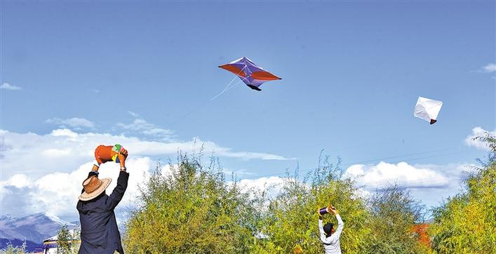 每年金秋時節(jié),在拉薩城的上空,便會出現(xiàn)千百只風(fēng)箏漫天飛舞、爭奇斗艷的景觀。在碧藍(lán)的天空下,那些形狀各異、如鷹似燕的風(fēng)箏,時而高飛、時而低落、時而旋轉(zhuǎn)、時而打斗,一旁觀戰(zhàn)或正在放風(fēng)箏的人仰頭觀看,歡呼聲、嘆息聲、助威聲此起彼伏,很是熱鬧。