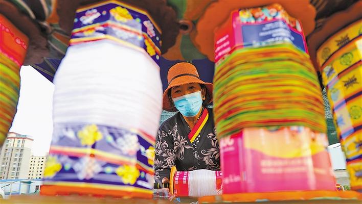 在拉薩河谷售賣風(fēng)箏的攤位中,拉薩風(fēng)箏制作技藝自治區(qū)級代表性傳承人普窮的生意最紅火,經(jīng)常有客人一買就是幾十只風(fēng)箏。