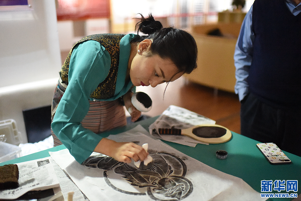 9月29日,在西藏大學(xué)新校區(qū)圖書館,日喀則石刻藝術(shù)博物館專業(yè)傳拓員德吉白珍演示拓片制作過程。新華網(wǎng) 旦增努布 攝