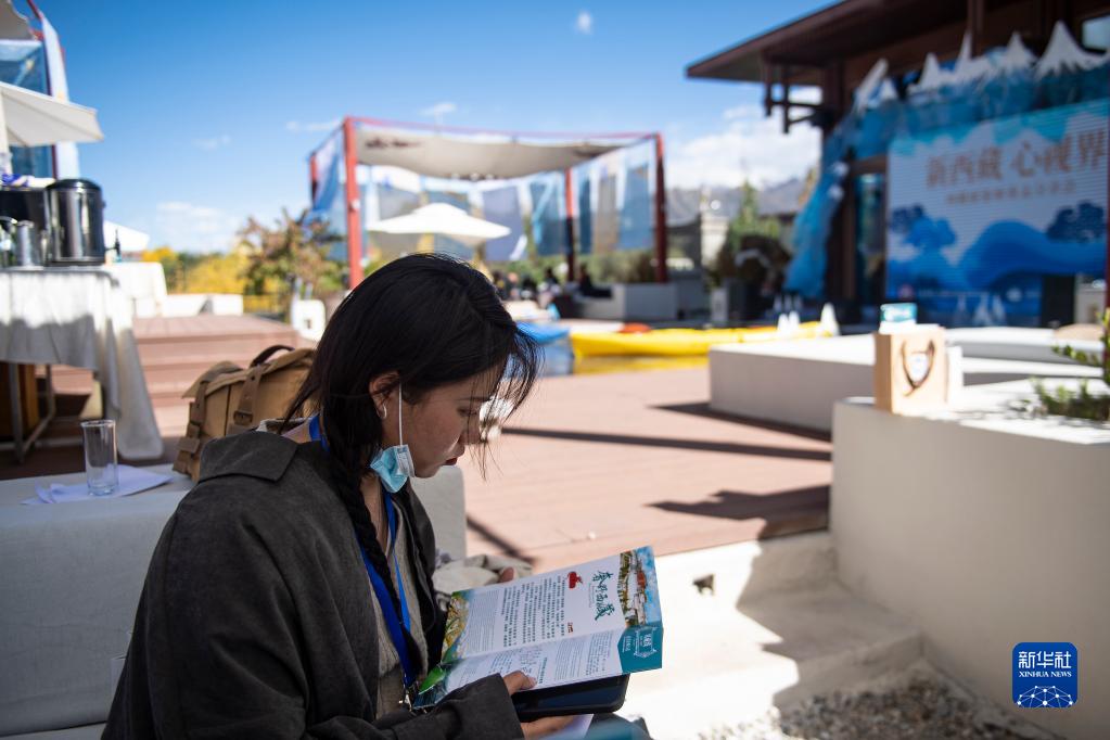 9月30日,一名媒體記者在西藏旅游新業(yè)態(tài)分享會(huì)上翻看西藏旅游線路的相關(guān)介紹。新華社記者 孫瑞博 攝