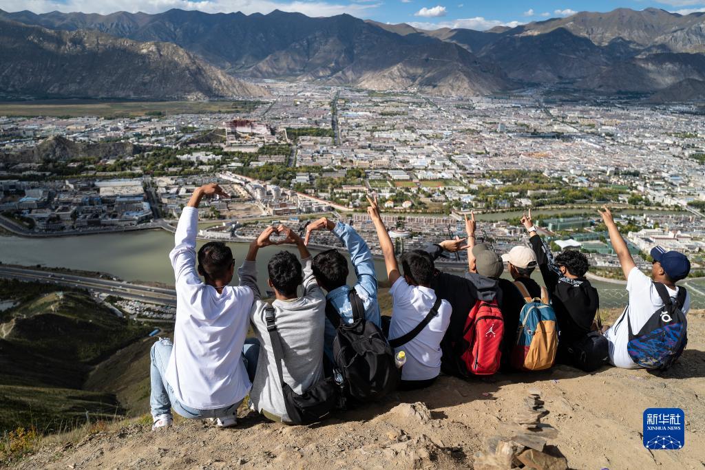一群大學(xué)生在拉薩市南山生態(tài)園的祖國(guó)萬(wàn)歲山山頂合影(9月20日攝)。新華社記者 孫瑞博 攝
