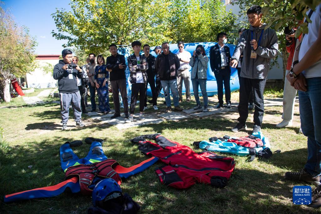 9月30日,一名工作人員在西藏旅游新業(yè)態(tài)分享會(huì)上介紹漂流項(xiàng)目中使用的救生裝備。新華社記者 孫瑞博 攝
