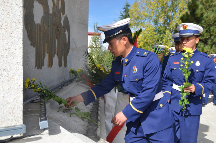 圖為西藏森林消防總隊(duì)特勤大隊(duì)在青藏川藏公路紀(jì)念碑前敬獻(xiàn)鮮花。