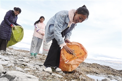 在瑪旁雍措國家級濕地自然保護(hù)區(qū)吉吾管理站,20歲的濕地保護(hù)管護(hù)員次仁旺姆和同伴在水邊撿拾垃圾。
