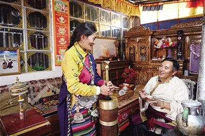 居住在阿里噶爾縣康樂新居的斯瓊正在品嘗妻子普珍制作的酥油茶。2017年,斯瓊一家從海拔4570米的改則縣麻米鄉(xiāng)搬入了噶爾縣生態(tài)安置小區(qū)康樂新居。據(jù)了解,根據(jù)西藏自治區(qū)黨委、政府的決策部署,當(dāng)?shù)卣畬0?700米以上極高海拔地區(qū)實(shí)施生態(tài)搬遷,實(shí)現(xiàn)群眾脫貧致富和生態(tài)環(huán)境改善。