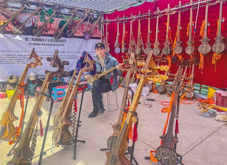 圖為銷售民族樂(lè)器的商戶正在為消費(fèi)者現(xiàn)場(chǎng)彈奏“扎念”。
