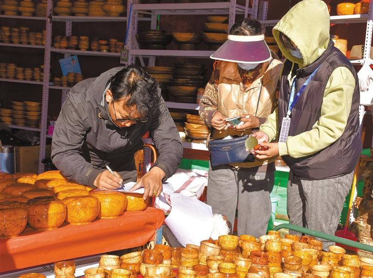 山南本地的特色優(yōu)質(zhì)商品尤其受到青睞:扎囊的氆氌,洛扎的粉絲,瓊結(jié)的蕎麥面,加查的核桃、木碗,貢嘎的邦典、紅土豆,措美的奶渣、牛羊肉等等,紛紛占據(jù)重要展位,引來(lái)消費(fèi)者紛至沓來(lái),熱情選購(gòu)。