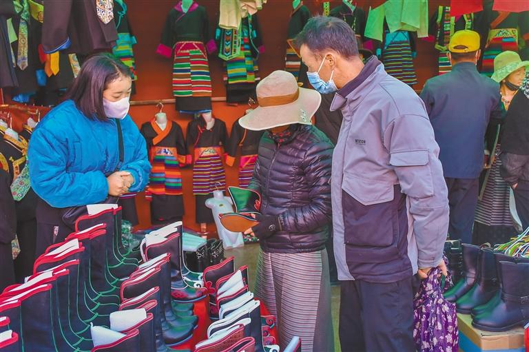 圖為消費(fèi)者正在選購(gòu)藏靴。