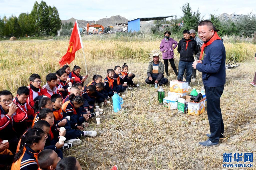 援藏教師潘杰帶著學生在青稞地里上思政課(9月14日攝)。