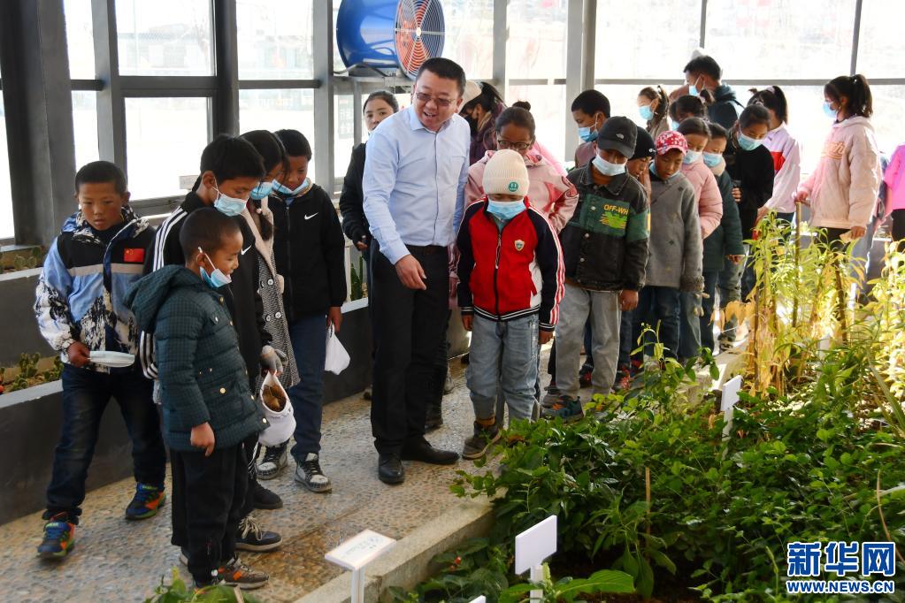勞動教育課上,援藏教師潘杰和藏族學生在一起(2021年9月14日攝)。