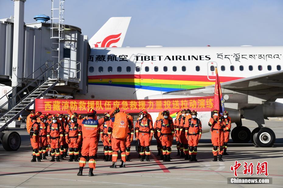 1月20日,西藏自治區(qū)消防總隊在拉薩貢嘎國際機場開展2022年跨區(qū)域地震災(zāi)害應(yīng)急救援力量投送拉動演練。據(jù)悉,演練投送的裝備主要為個人72小時保障物資、通信器材和輕便型的相關(guān)救援器材。 中新社記者 貢嘎來松 攝