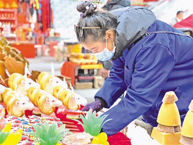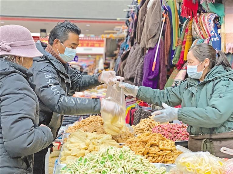 漫步八廓商城,從一樓到三樓,攤位整齊有序。風(fēng)干的牛羊肉、色彩斑斕的“卡賽”醉人的青稞酒……從節(jié)日用品、服裝飾品到干果零食,各式各樣的年貨琳瑯滿(mǎn)目。