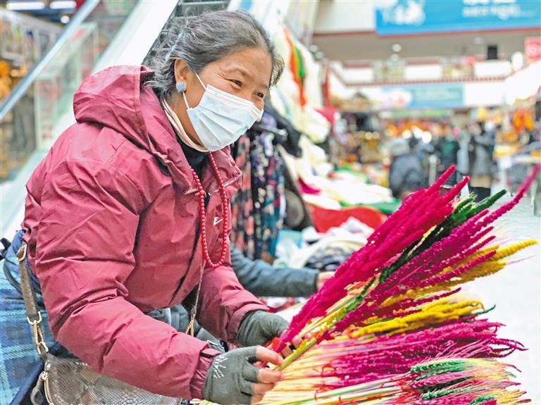 早在1月18日,八廓商城年貨市場(chǎng)就以全區(qū)低收入群體為主,通過(guò)抽簽式發(fā)放攤位269個(gè)。今年,八廓商城年貨攤位主要包括糖果、木制品、酥油、酥油花、奶制品、“卡賽”、對(duì)聯(lián)、青稞草、青稞花、風(fēng)干牦牛肉等。