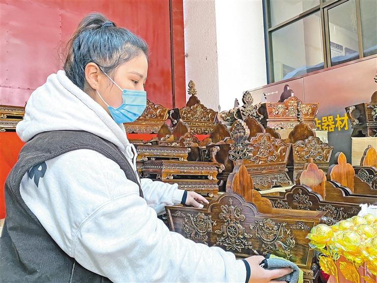 來(lái)自山南市貢嘎縣的拉吉帶著自家生產(chǎn)的“切瑪盒”第2次來(lái)到八廓商城年貨市場(chǎng)?!坝捎谑亲约疑a(chǎn),所以我們自主設(shè)計(jì)了一款線(xiàn)條稍微簡(jiǎn)約的‘切瑪盒’;還有一款傳統(tǒng)線(xiàn)條與圖案的‘切瑪盒’。在顏色上,我們選擇了較為持重的深色,這樣的顏色大氣沉穩(wěn),許多市民非常喜歡,兩款售價(jià)都是380元?!崩榻B道。