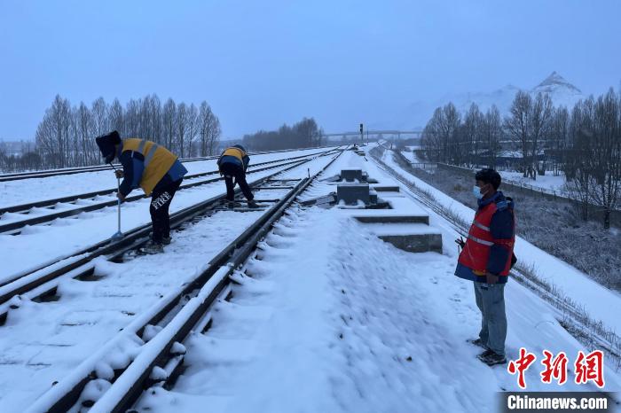 21日,西藏自治區(qū)日喀則市迎來大雪天氣,國鐵青藏集團有限公司拉薩基礎設施段日喀則信號車間立即啟動除雪應急預案,工區(qū)工長蒲志遠組織職工清掃積雪,保障拉日鐵路正常運營。