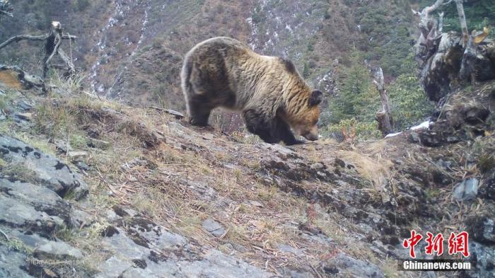 資料圖為2021年10月29日在西藏自治區(qū)丁青縣境內(nèi)由紅外相機(jī)拍攝到的棕熊活動(dòng)影像。 中新社發(fā) 山水自然保護(hù)中心 供圖