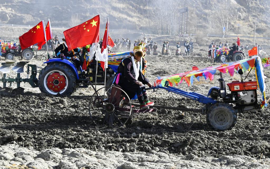 日頭漸高,春耕儀式準(zhǔn)備就位。門中崗社區(qū)黨總支書記央金卓嘎說:“開耕嘍!”頓時,14臺拖拉機(jī)發(fā)出隆隆轟鳴聲,肥沃的田地被犁出一道道深深的壟溝。