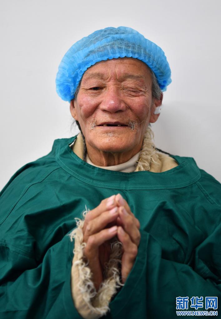 3月24日,今年82歲的西藏尼瑪縣中倉(cāng)鄉(xiāng)牧民桑旦雙手合十感謝醫(yī)生。新華社記者 覺果 攝
