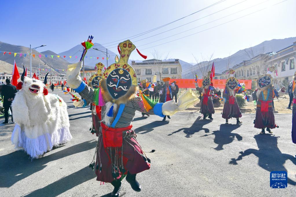 3月28日,南木林縣卡孜鄉(xiāng)群眾在湘河水庫移民新村表演藏戲。新華社記者 張汝鋒 攝