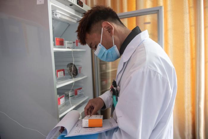 米瑪次仁在林芝市巴宜區(qū)更章鄉(xiāng)衛(wèi)生院清點疫苗庫存情況(2021年12月24日攝)。新華社記者 孫瑞博 攝