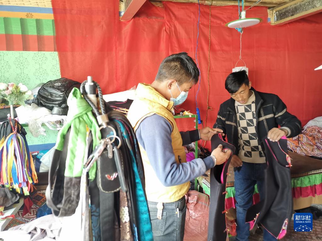 特布拉村村民拉巴平措(右)在介紹他制作的藏裝。新華社記者 林建楊 攝(手機照片,4月16日攝)