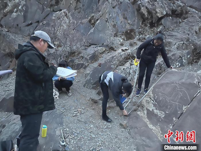 圖為日喀則石刻藝術(shù)博物館工作人員測(cè)量巖畫(huà)尺寸。日喀則石刻藝術(shù)博物館供圖