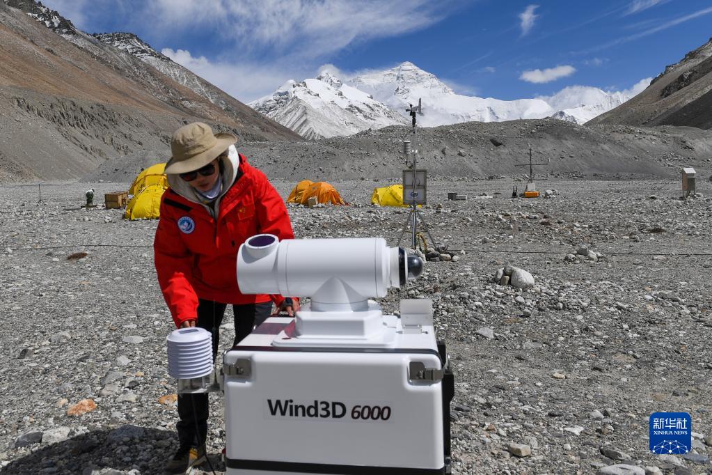 在珠峰登山大本營,科研人員檢查臭氧通量裝置運(yùn)行情況(5月3日攝)。新華社記者 姜帆 攝