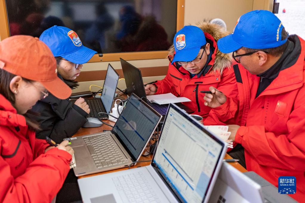 在珠峰登山大本營的氣象應(yīng)急保障車內(nèi),西藏自治區(qū)氣象局工作人員在討論天氣實(shí)況(5月3日攝)。新華社記者 孫非 攝