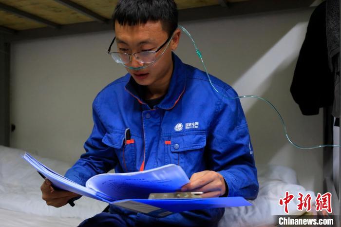 圖為付新程完成當日的檢修工作,在宿舍內(nèi)一邊吸氧氣,一邊研究工作方案。孟瑋 攝
