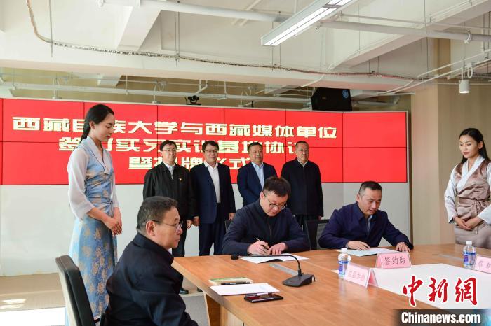 5月27日,西藏民族大學(xué)與西藏日報社、西藏廣播電視臺、人民網(wǎng)西藏頻道、中國新聞社西藏分社、中國西藏網(wǎng)西藏記者站等媒體單位簽訂實習(xí)實訓(xùn)基地協(xié)議暨揭牌儀式在西藏日報舉行。