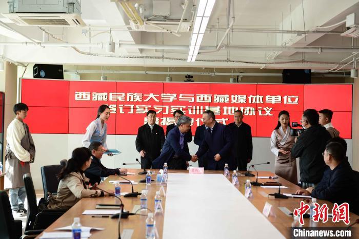圖為簽約儀式上媒體單位負責(zé)人跟西藏民族大學(xué)的實習(xí)生合影?!∝暩聛硭?攝