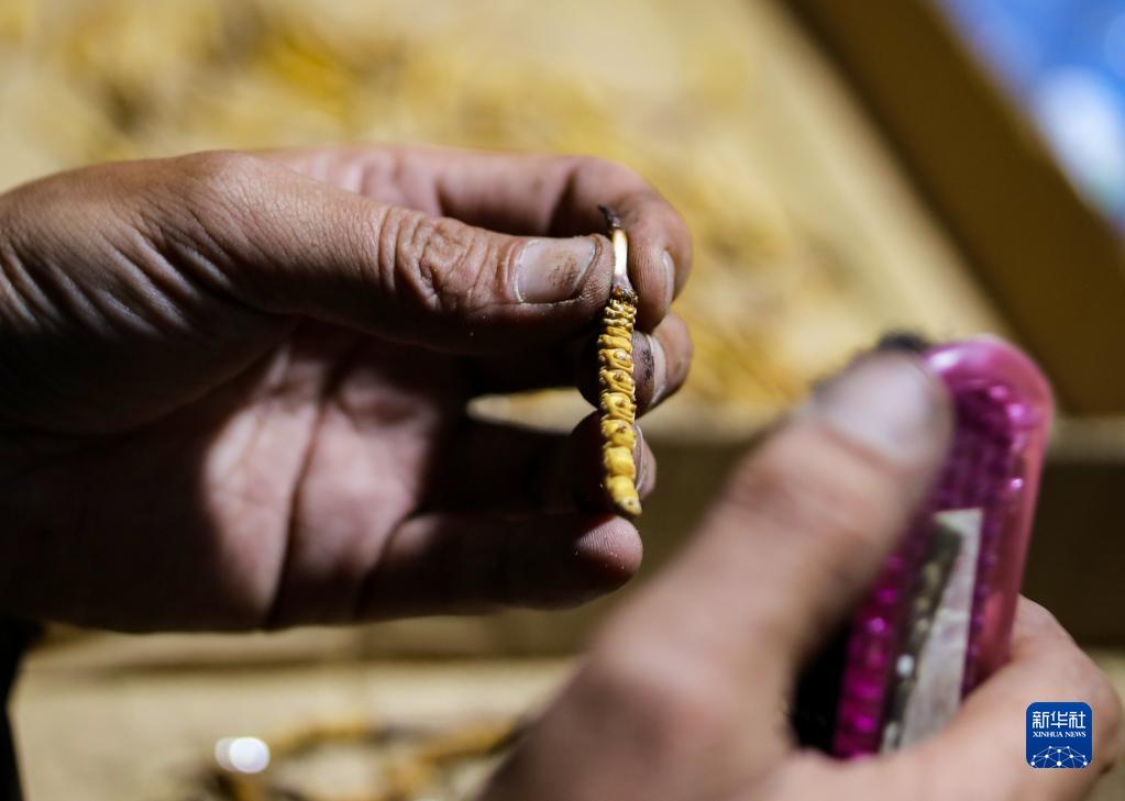 傍晚回到采集點(diǎn)營地后,牧民在用毛刷清理蟲草上的土(5月25日攝)。新華社記者 姜帆 攝