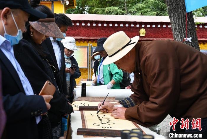 圖為活動現(xiàn)場,藏文書法展示?!≮w朗 攝
