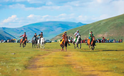 藏族群眾騎馬在草原上馳騁。單鵬云攝