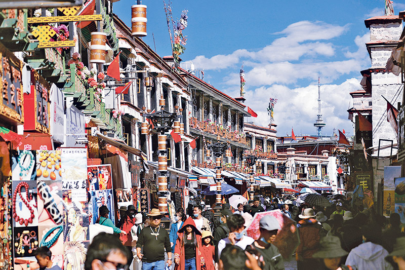 民族團(tuán)結(jié)是西藏各族人民的生命線。習(xí)近平總書(shū)記強(qiáng)調(diào):“推動(dòng)西藏高質(zhì)量發(fā)展,要堅(jiān)持所有發(fā)展都要賦予民族團(tuán)結(jié)進(jìn)步的意義,都要賦予改善民生、凝聚人心的意義,都要有利于提升各族群眾獲得感、幸福感、安全感。”八廓街的各民族“猶如茶與鹽巴”相互交融,相親相愛(ài)、攜手奮斗,書(shū)寫(xiě)著“中華民族一家親、同心共筑中國(guó)夢(mèng)”的動(dòng)人篇章。