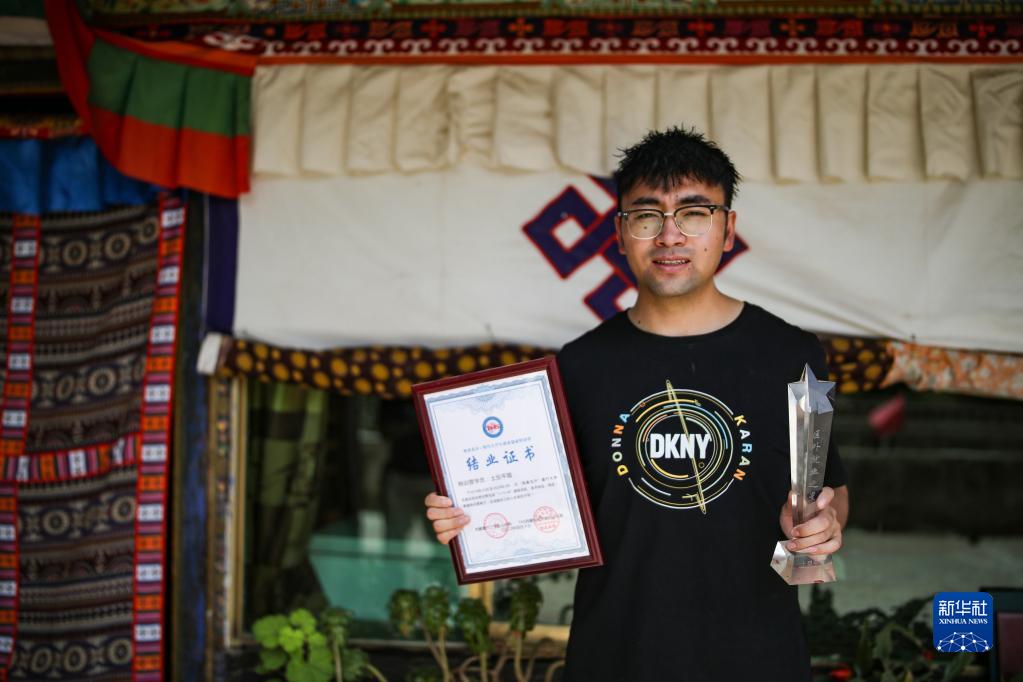 “格桑花開”大學生就業(yè)創(chuàng)業(yè)特訓營學員、江蘇今世緣酒業(yè)股份有限公司甘青藏大區(qū)業(yè)務經(jīng)理土旦平措展示特訓營結(jié)業(yè)證書和“區(qū)外就業(yè)之星”獎杯(2022年6月23日攝)。新華社記者 姜帆 攝