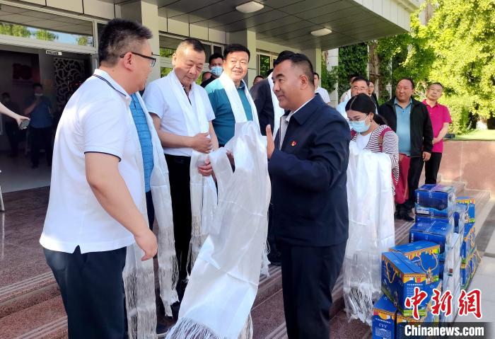 圖為日土縣縣長達(dá)瓦次仁為考察團一行獻(xiàn)哈達(dá)。日土縣縣委供圖