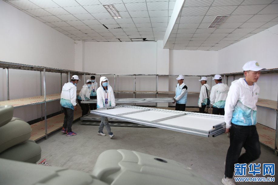 志愿者正在布置運(yùn)動(dòng)會場地。(劉勇 攝)