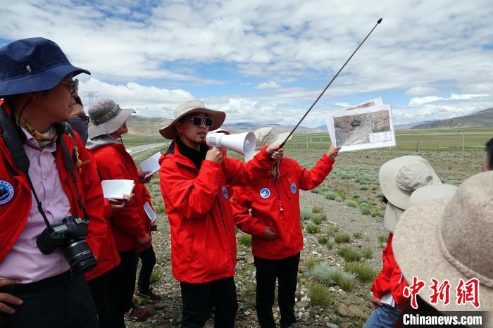 科考隊(duì)員、中國(guó)科學(xué)院青藏高原研究所張帥博士在古湖底分析講解瑪不錯(cuò)和嘎拉錯(cuò)劇變之謎。中新社記者 孫自法 攝