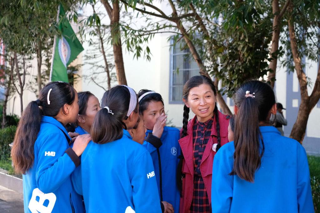 劉斯(著紅衣者)與昌都市卡若區(qū)第二初級中學(xué)學(xué)生一起探討交流學(xué)習(xí)。(受訪者供圖)