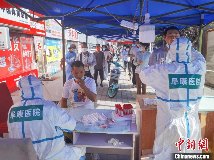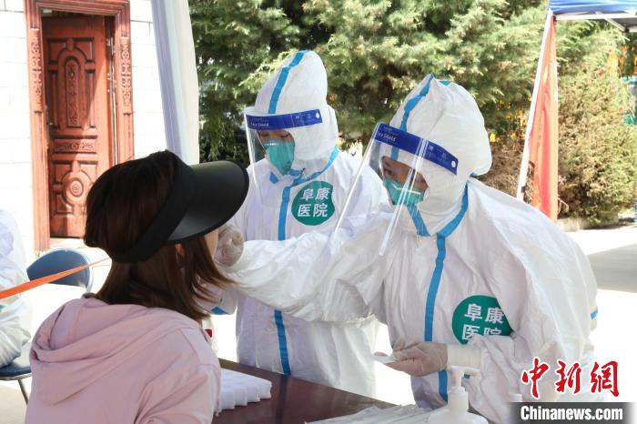 圖為西藏阜康醫(yī)院醫(yī)務人員在社區(qū)進行核酸采樣。阜康醫(yī)院供圖