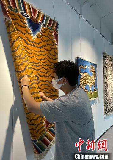 展廳中央地板上,90*190厘米的各色藏毯相連鋪開,這是藏族民眾最常用的、鋪在床鋪上的尺寸;兩旁墻上,懸掛多幅圖案復雜精細的大尺寸掛毯,這是重于藝術性的現(xiàn)代創(chuàng)作:好似唐卡的財寶天王掛毯、讓人有油畫錯覺的珠穆朗瑪峰風景掛毯……另有一張長逾1米的虎毯,主色深黃、虎紋考究,上下兩端織有七彩紋飾,非常搶眼。若將虎毯翻轉,還會發(fā)現(xiàn)反面亦是清晰齊整的虎紋,與正面幾無差異。