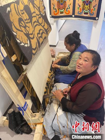 圖為在展廳中兩位藏族阿佳正一邊編織藏毯,一邊經過工作人員翻譯與觀展者聊天。李晗雪 攝