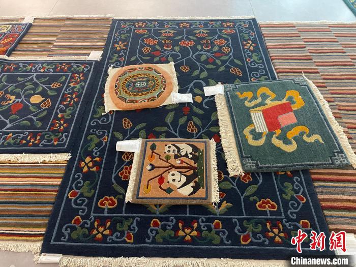 圖為展廳中展示的傳統(tǒng)藏毯及創(chuàng)新設計的坐墊大小的藏毯。李晗雪 攝