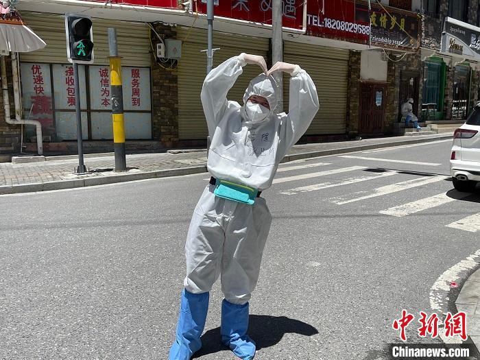 民警賀東在做好自身防護的前提下不停巡邏排查,一轉(zhuǎn)就是8個小時。他為民眾、游客及工人聯(lián)系購買生活物資、煤氣等。汗水浸濕在口罩里,不到一會,“大白”就能“喝”到自己的汗水。