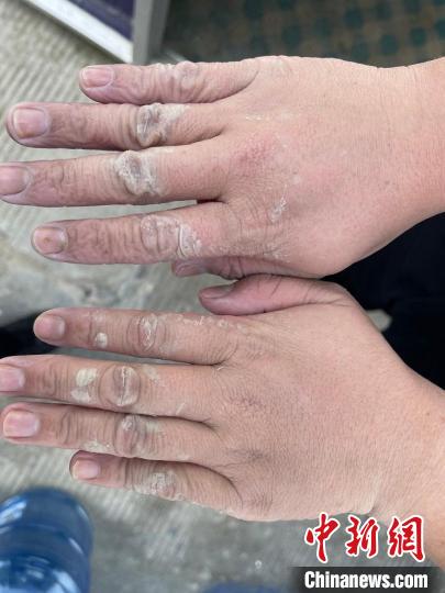 圖為民警被手套泡得發(fā)白的手。西藏日喀則邊境管理支隊 攝