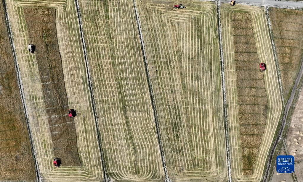 西藏日喀則市江孜縣熱索鄉(xiāng)努康村農(nóng)機(jī)合作社的村民集中對(duì)村里三千多畝耕地進(jìn)行機(jī)械化收割(9月19日攝,無人機(jī)照片)。新華社記者 晉美多吉 攝