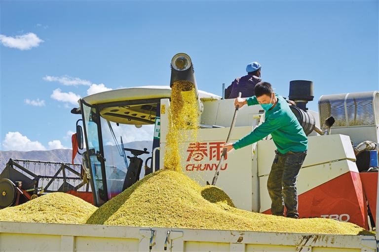 9月19日,日喀則市江孜縣熱索鄉(xiāng)努康村村民次仁多杰正在用大型收割機(jī)收獲青稞。次仁多吉 記者 扎西頓珠 攝