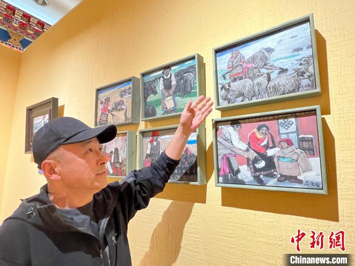 策展人李亞男向中新網(wǎng)記者介紹,崔曉曉首次到西藏那曲便結(jié)識(shí)了一位當(dāng)?shù)嘏笥选麑⑦@位藏族青年放牧、添置汽車、蓋新房等畫(huà)面用畫(huà)筆記錄了下來(lái),在本次展覽中展出。