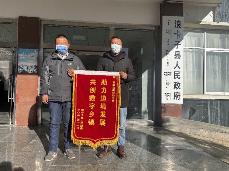 浪卡子縣政府向中國(guó)移動(dòng)山南分公司授予“助力邊境發(fā)展 共創(chuàng)數(shù)字鄉(xiāng)鎮(zhèn)”錦旗。